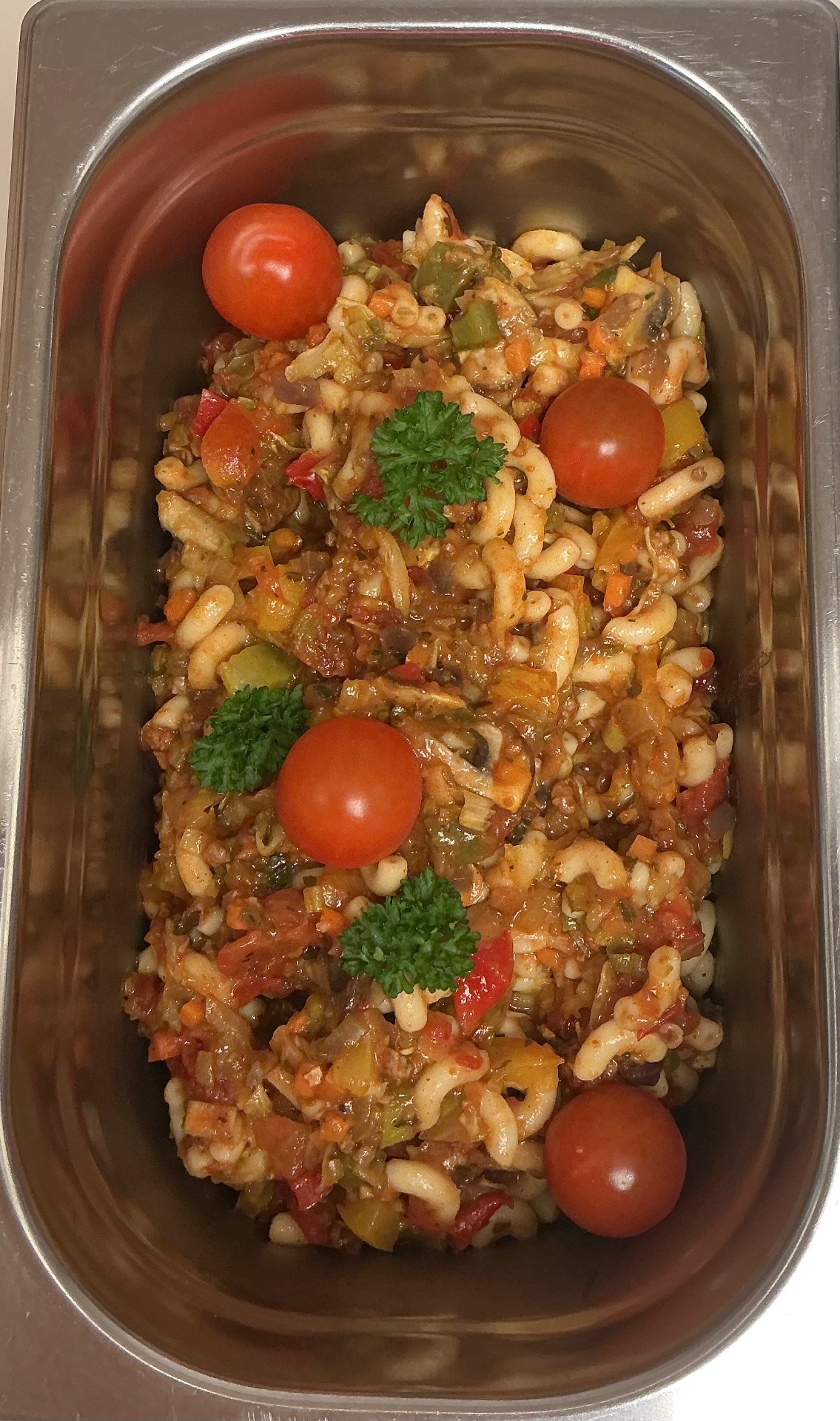 Rijkelijk gevulde macaroni met diverse groentes, en gebakken boterhamworst.